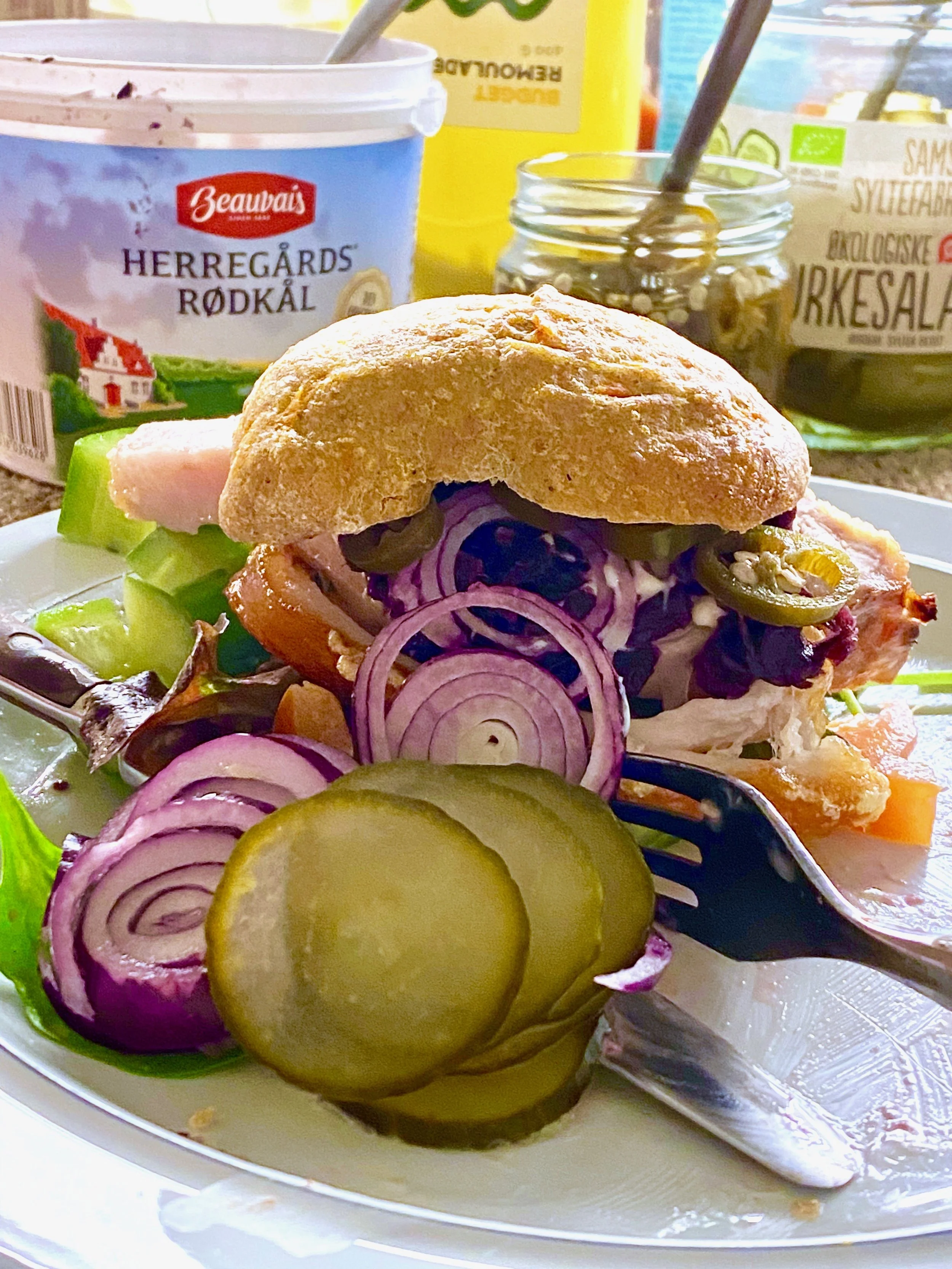 Ingen af os var helt sikre på, hvad vi havde aftalt med hinanden, så vi nød et glas rødvin lørdag aften i selskab med hjemmelavet flæskestegburger 😉