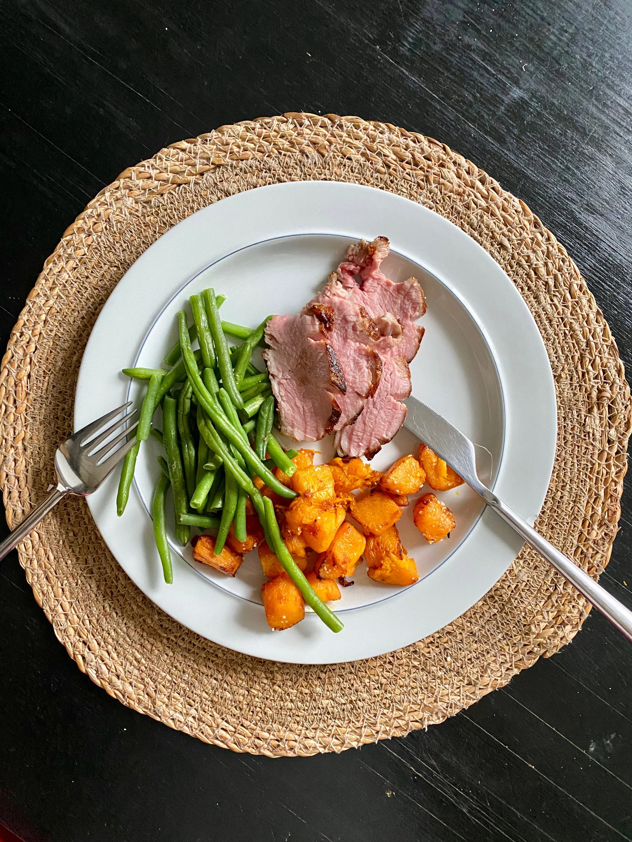 Culottesteg med grønne bønner og stegt græskar