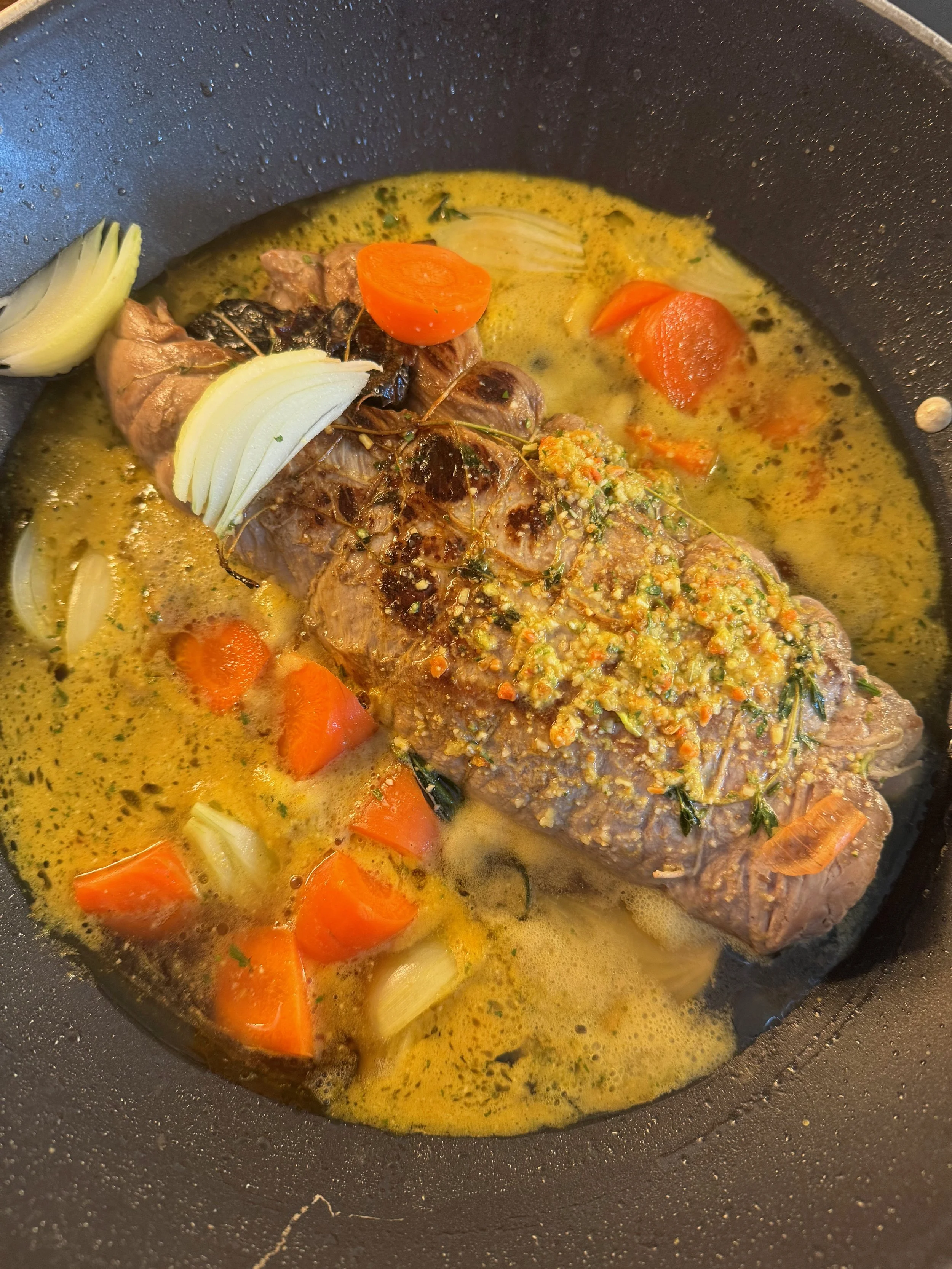 Der blev leveret mormormad til en af børnefamilierne i gaden - rullesteg med svesker og kartofler og selvfølgelig den brune sovs.