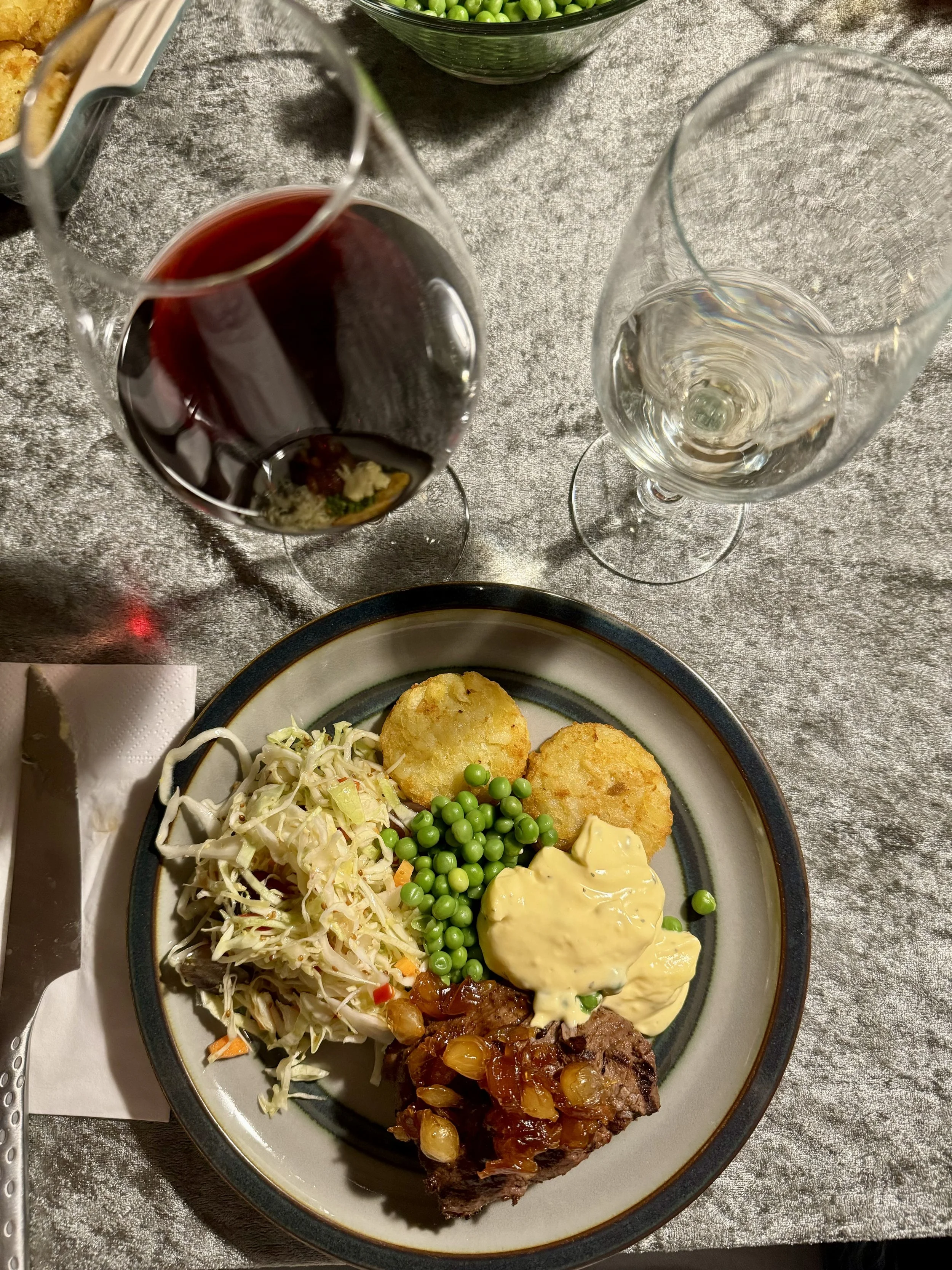 Herefter ventede en lækker middag med rejer og avocado til forret og oksemørbrad med salater, stegte kartofler og bearnaisesauce - alt ledsaget af vin ad libitum.