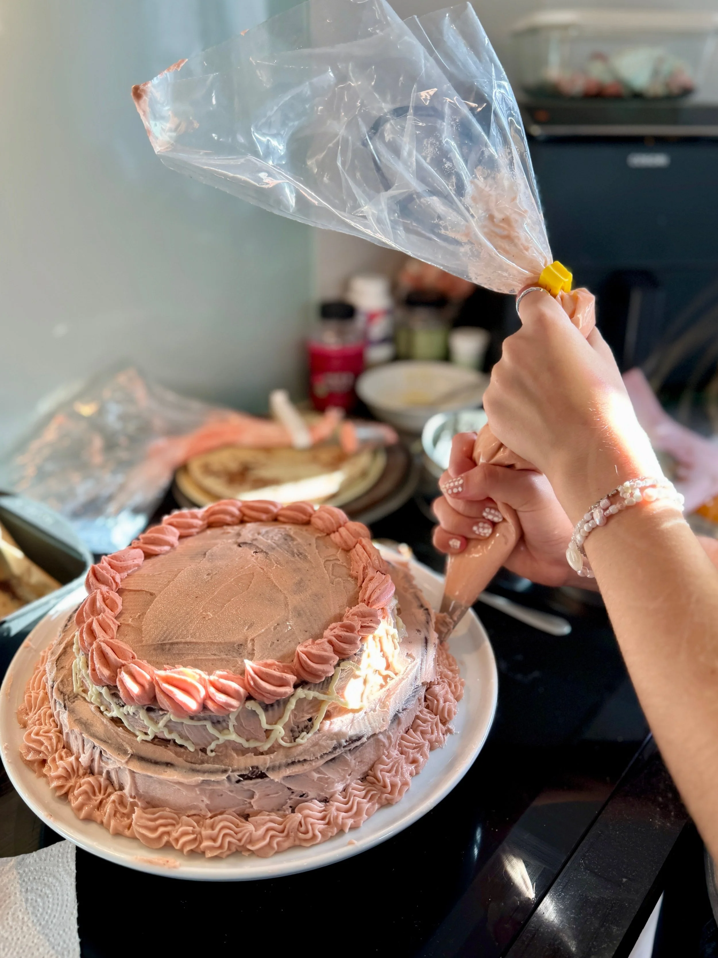Fødselaren havde selv bagt kagen og her i gang med pyntningen