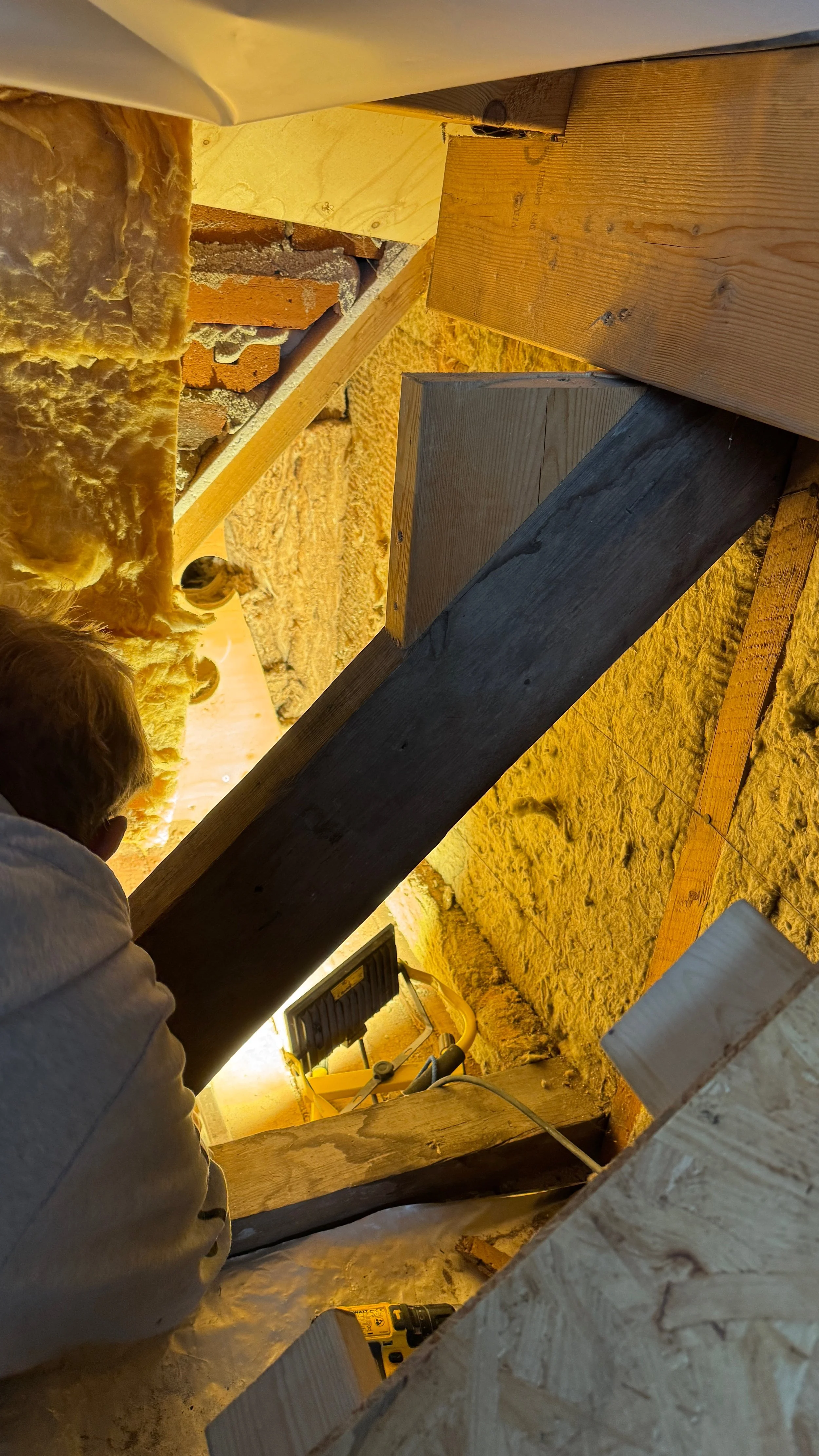 Lidt isolering er det dog blevet til i denne uge - manden måtte ind i hullet på øverste etage, og det var ikke nemt.