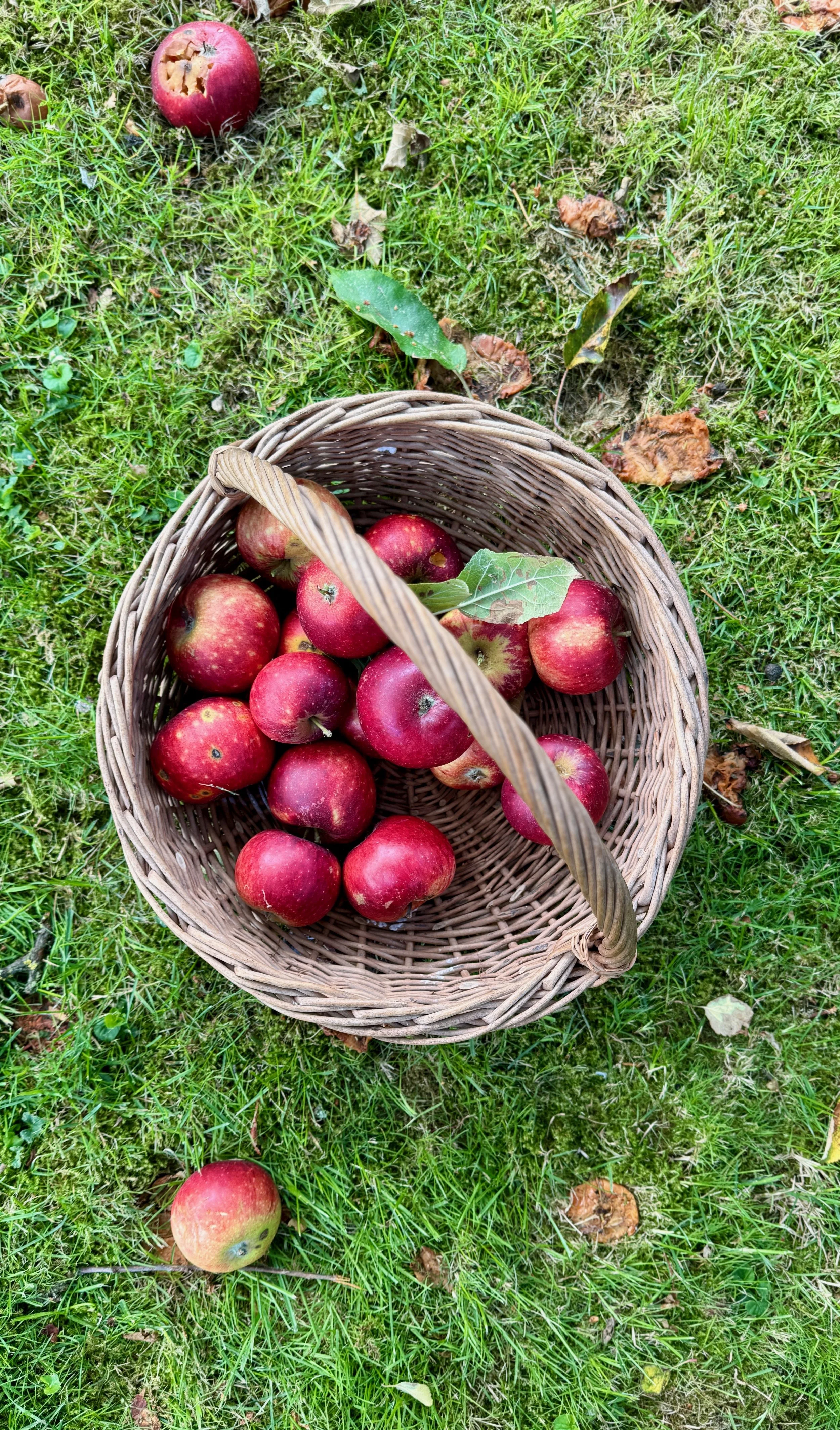 Vi har nogle dejlige Ingrid Marie æbler i vores have, og jeg har plukket en kurv fuld, så jeg kan få lavet en lækker æblekage.