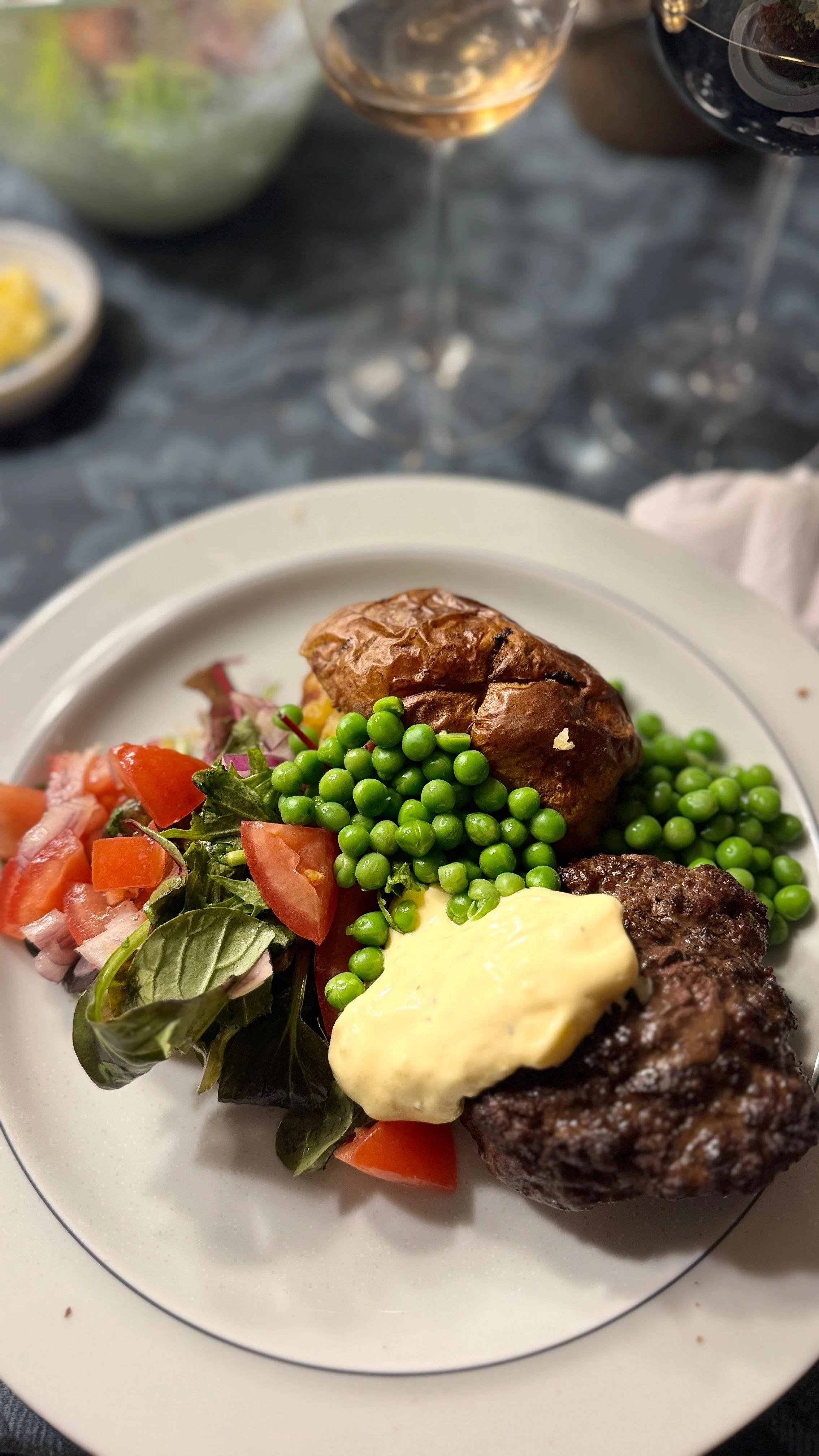 Vi hyggede os over kogte krabbeklør med hjemmebagt surdejsboller, bisonhakkebøffer med tryllekartofler (fyldte kartofler), ærter og bearnaisesauce og fransk æbletærte med creme til dessert.