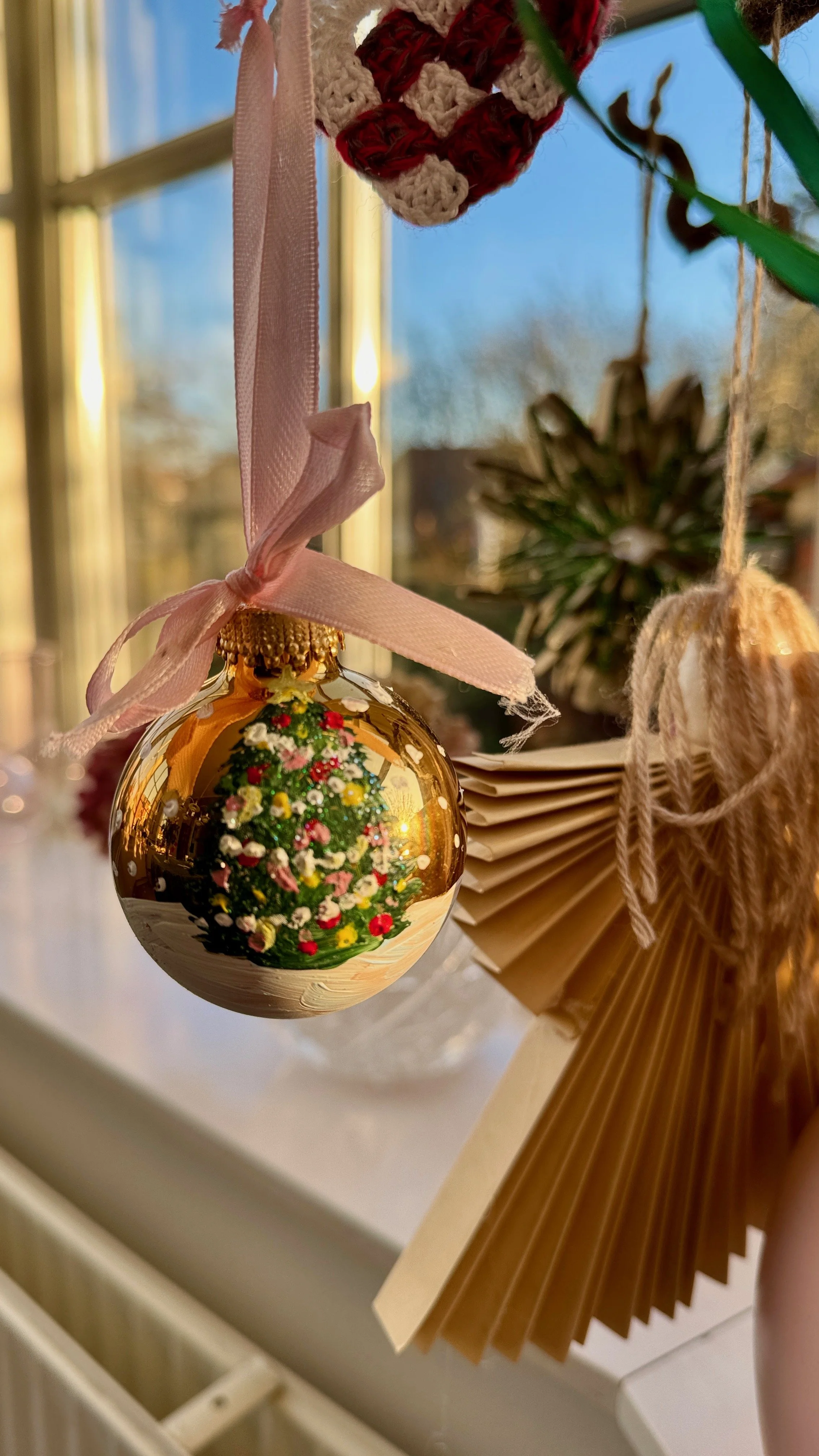 Den fine julekugle hænger ved siden af englen, som jeg fik til min fødselsdag