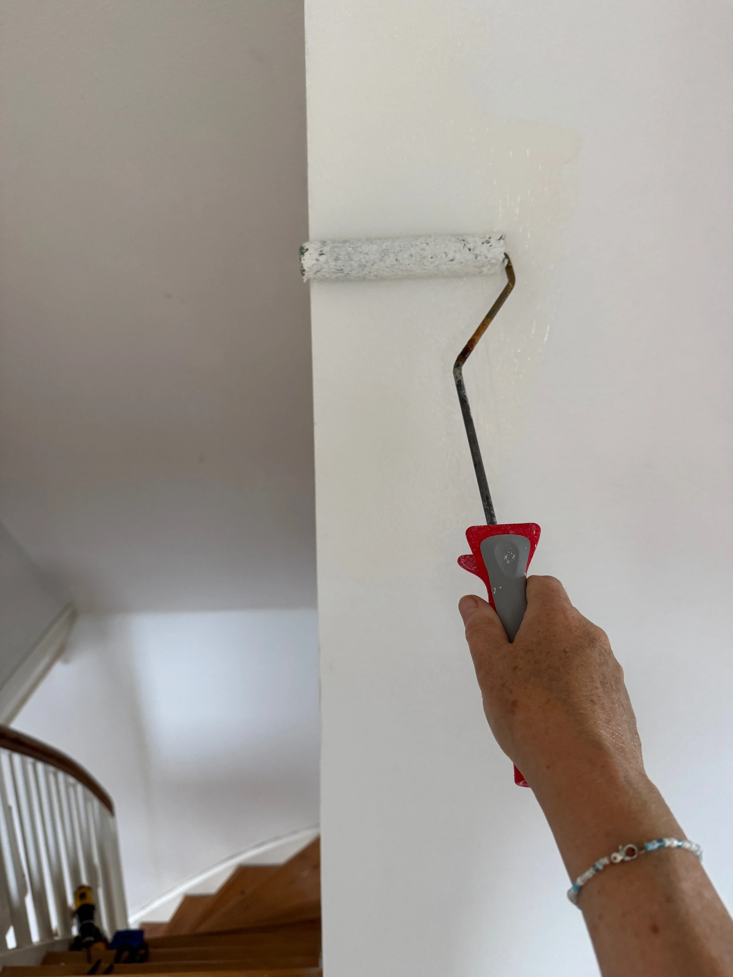 Arbejdet skrider stille og roligt fremad, og gangen begynder at ligne det, som jeg havde forestillet mig. Vi fik sat stuk op i weekenden, manden maler loftet, og jeg er i gang med at male væggene.