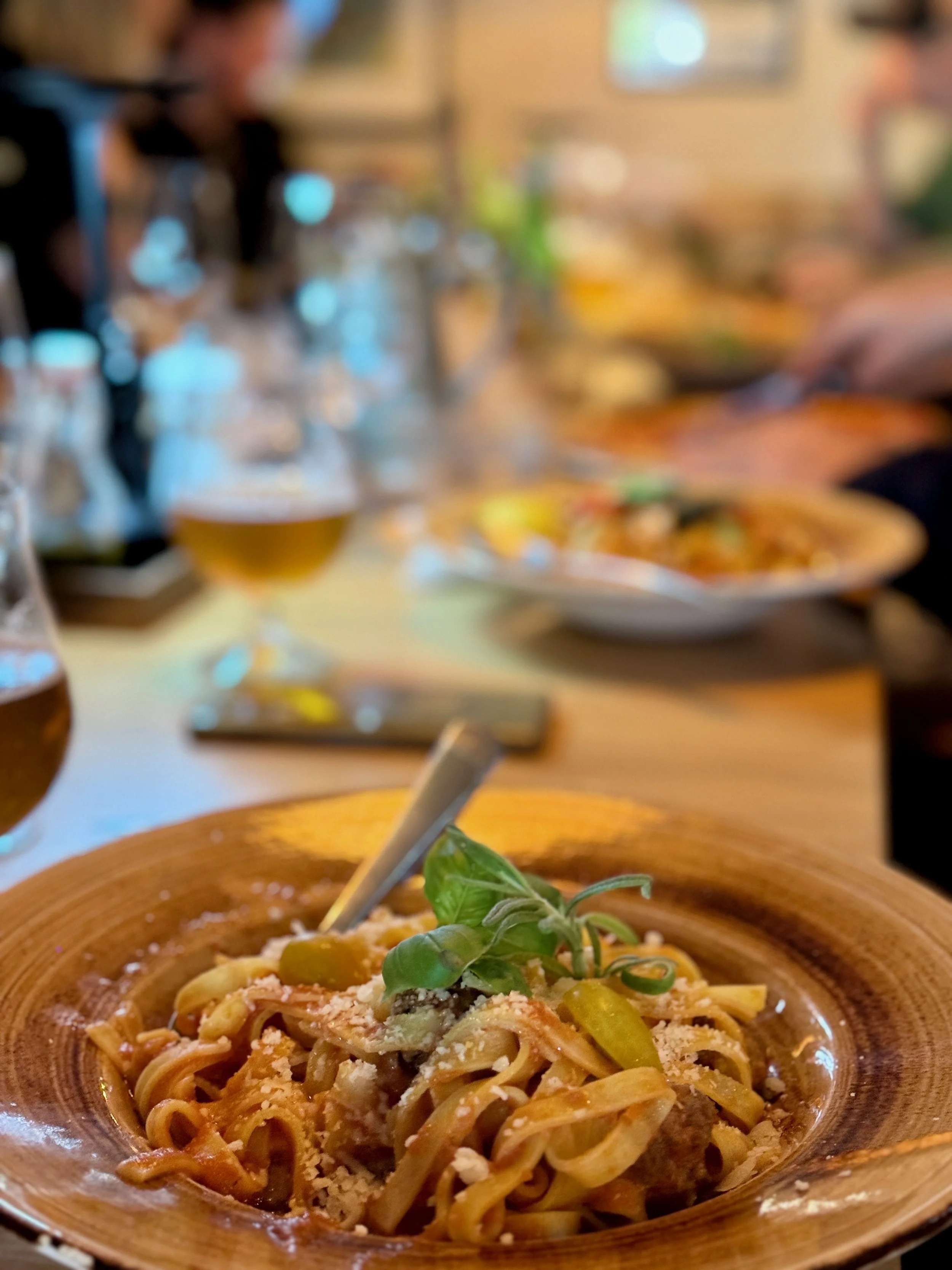 Jeg valgte en lækker forret med skønt italiensk bruschetta brød med hakkede friske tomater, hvidløg, basilikumdressing og krydderurter. Hovedretten var pasta med kødboller i tomatflødesauce - uhm…. en lækkerbisken. Jeg har aldrig besøgt restauranten før, men den kan varmt anbefales.
