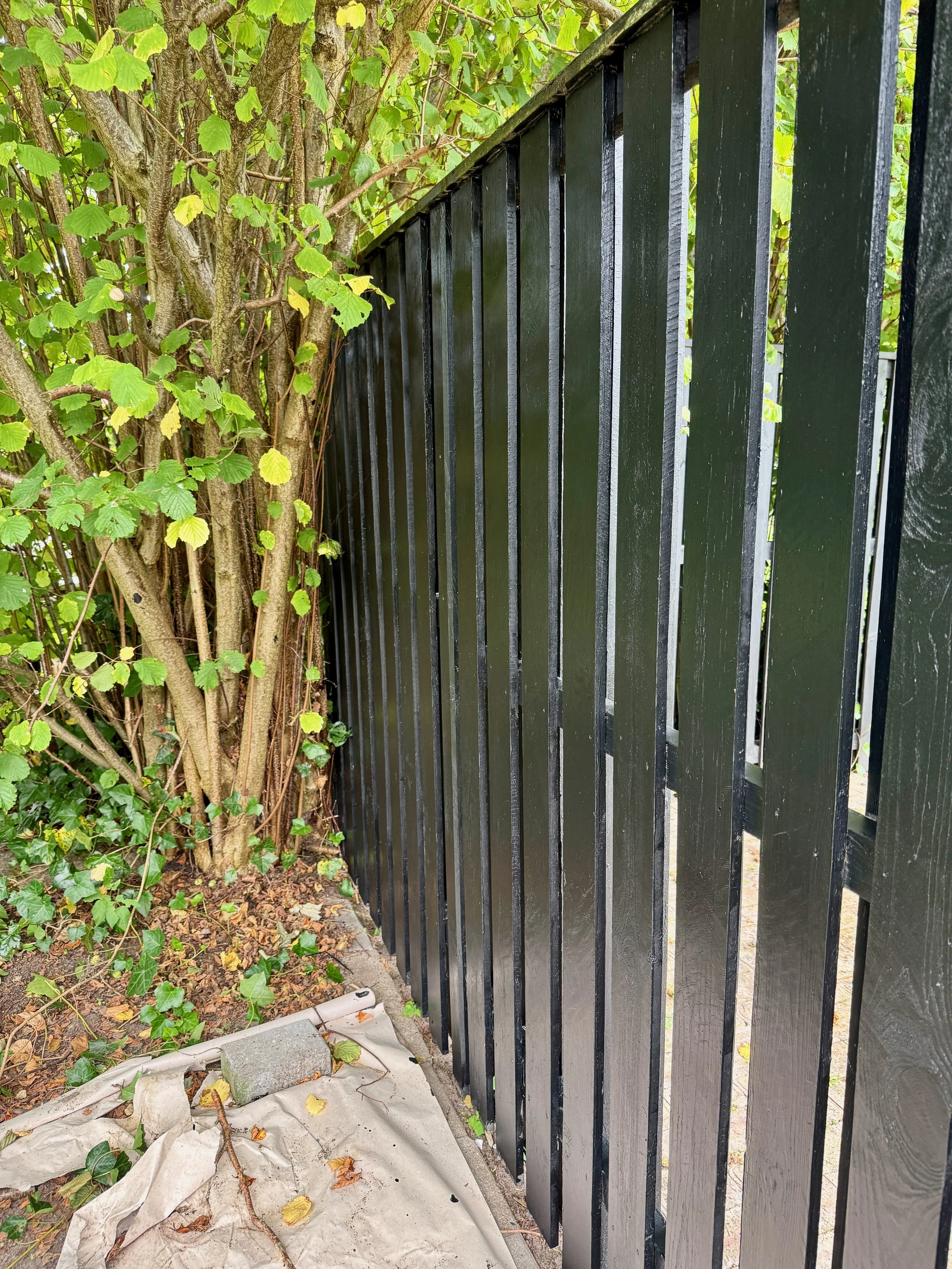 Nu står både hegn og skur knivskarpt - nymalet - sort.