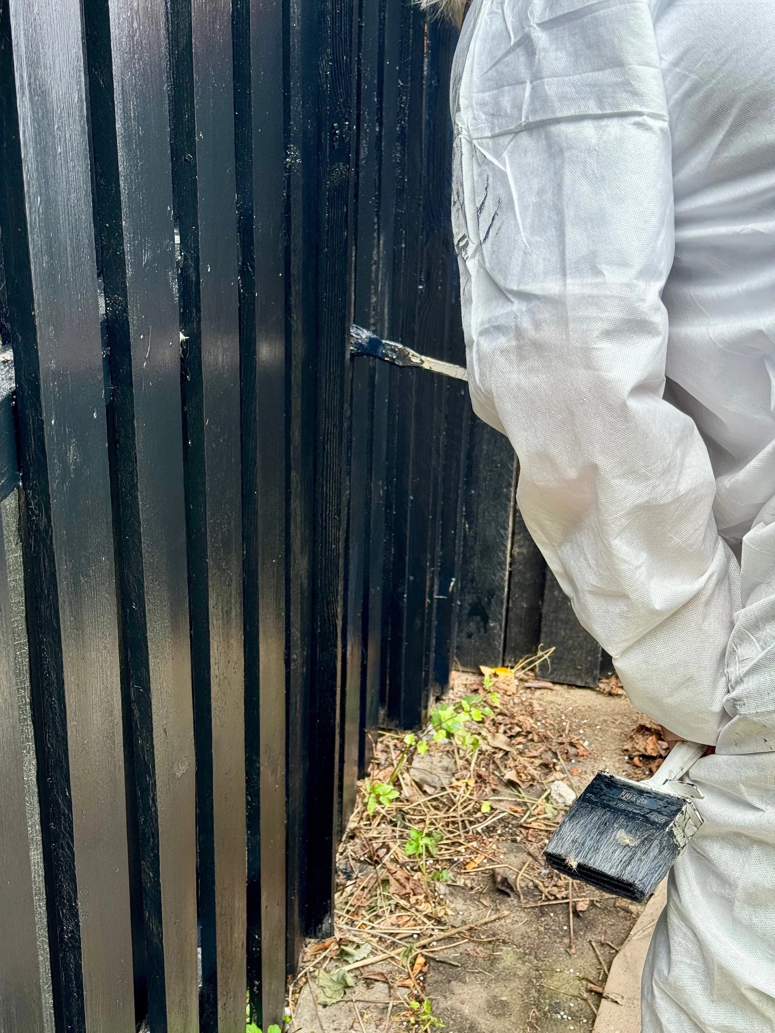 En god ven var så letsindig at tilbyde sin hjælp til os med at male vores hegn og skur i haven.