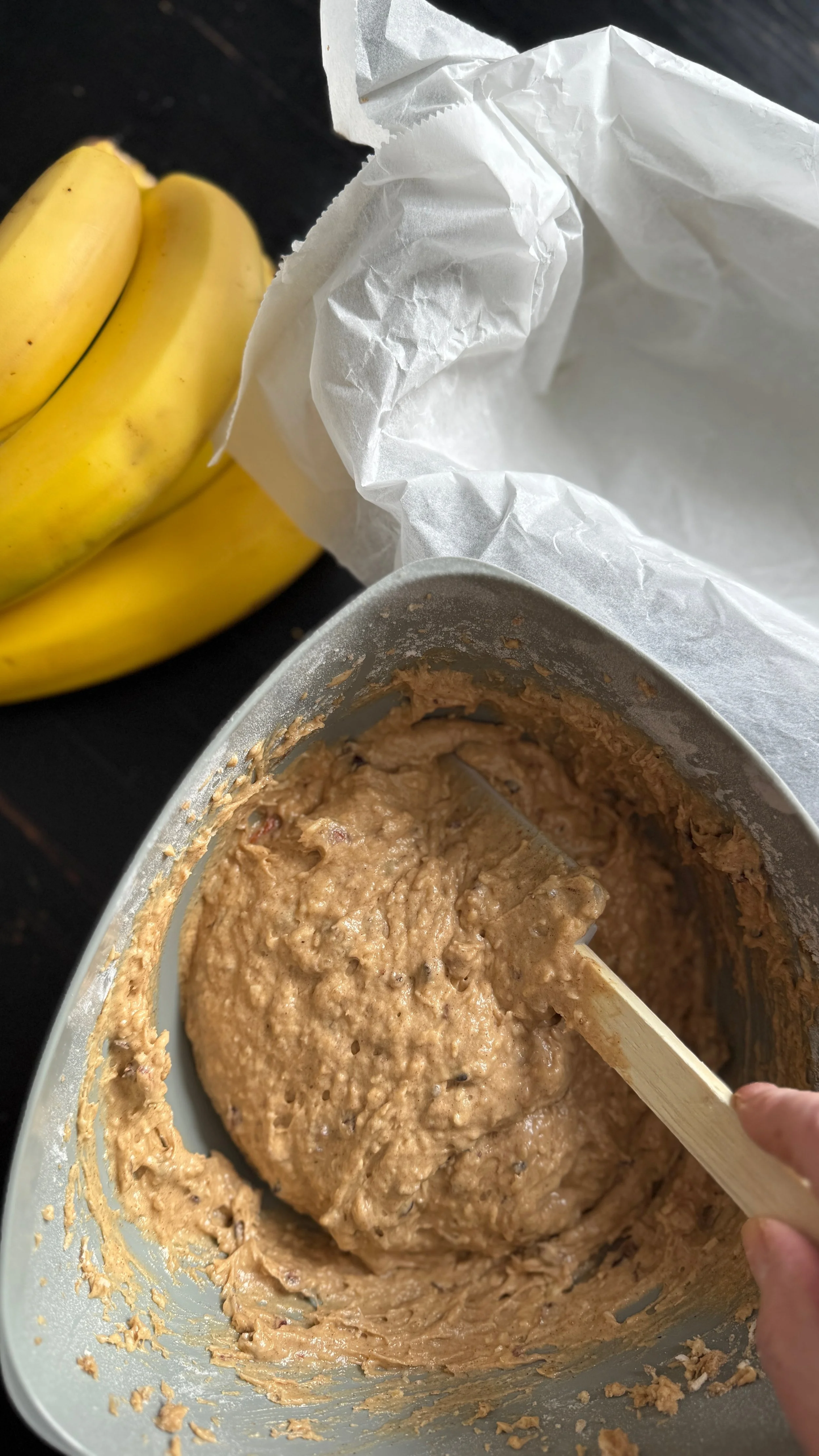 Sigt det i dejen og rør det i, sammen med bananer og nødder.