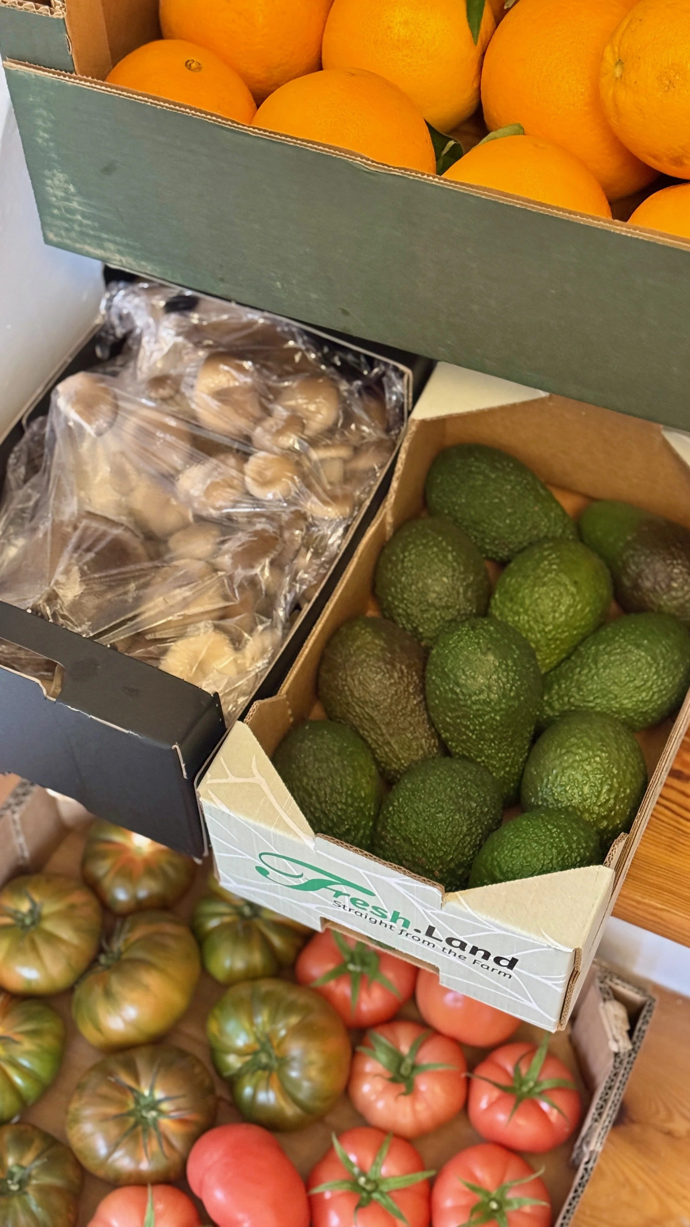 I denne uge fik jeg leveret en kasse bolsjebeder, østershatte, avocado, store tomater og appelsiner.