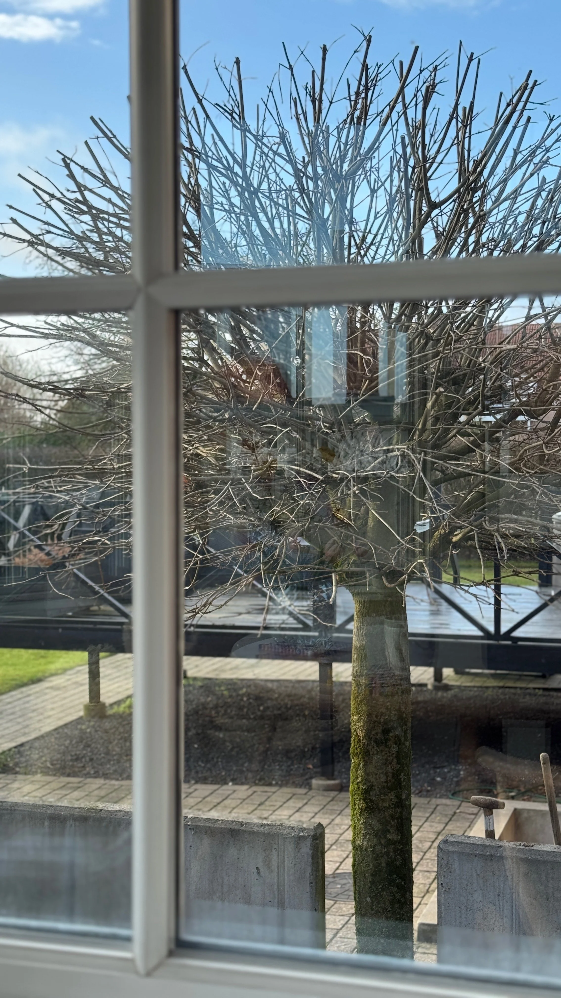 Vi har derfor haft en professionel gartner til at beskære træerne i vores indkørsel, og nu står de fint beskåret mellem naboen og os og venter på at blive dækket af blade.