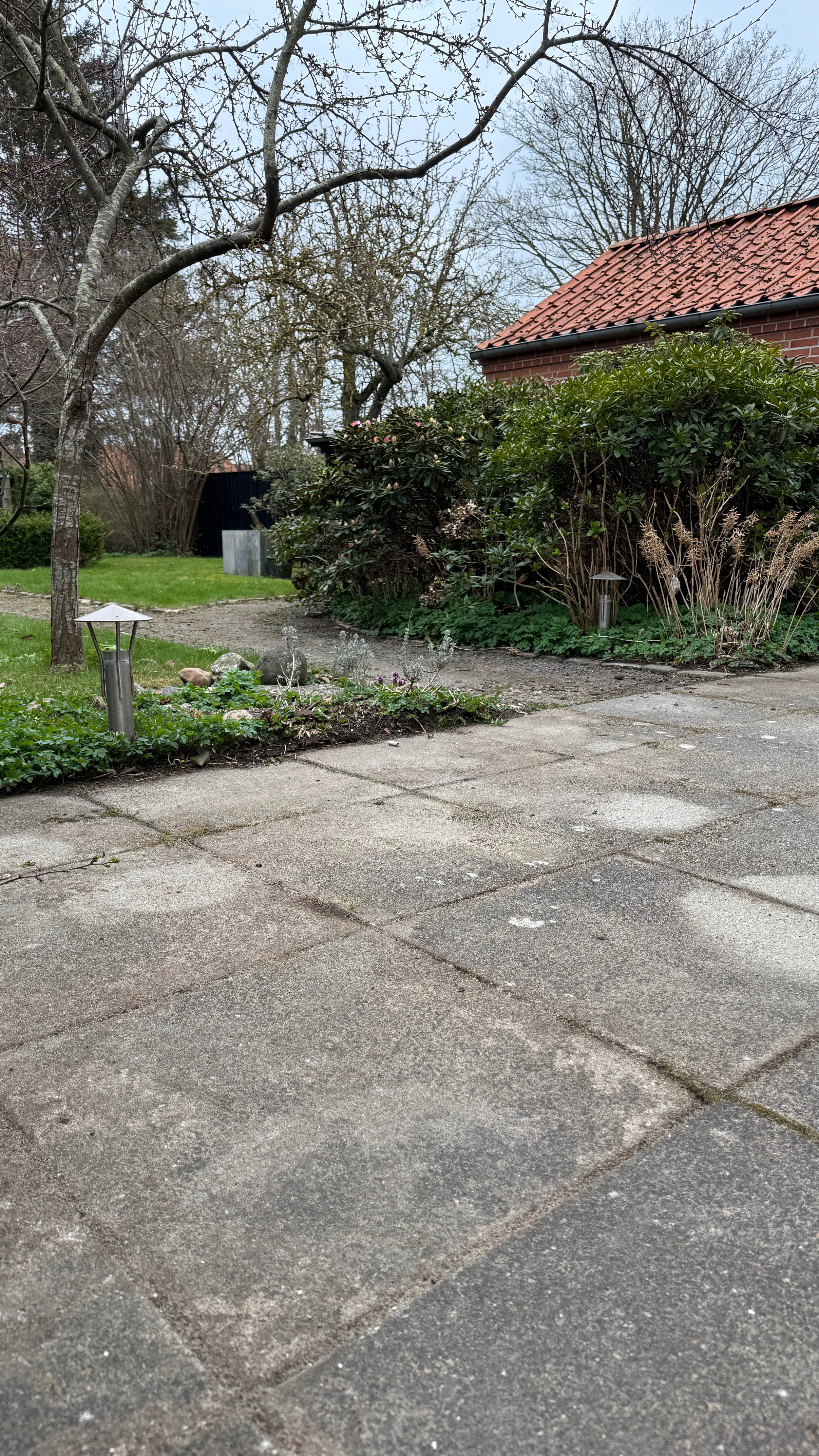 Jeg må indrømme, at det hele ser lidt mere ordentligt ud, når fliserne er ryddet, men til gengæld synes jeg altså, at blomster i krukker giver noget hygge.