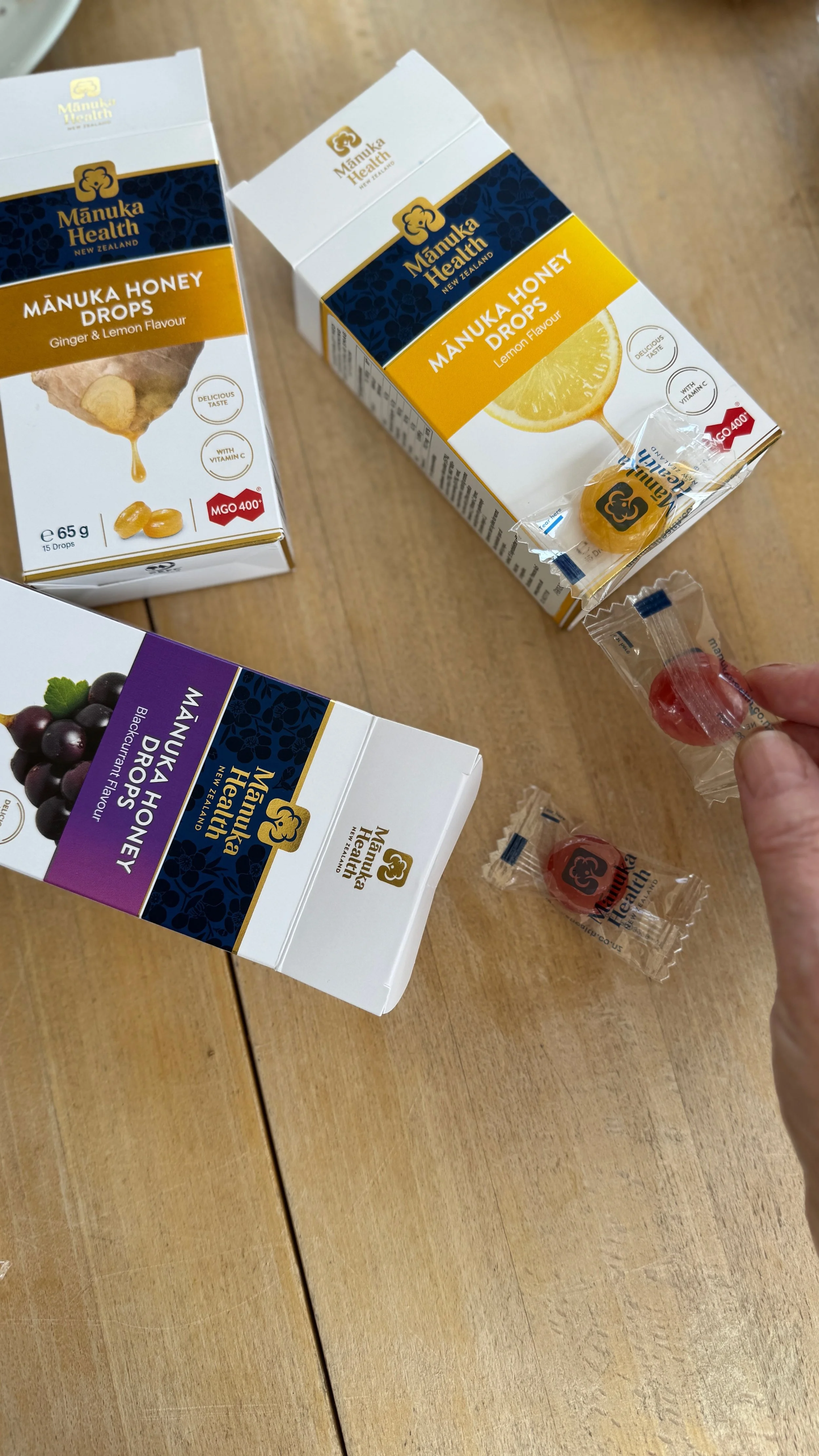 Jeg er ramt af en kraftig forkølelse og er gået til modangreb med Manukabolsjer til halsen