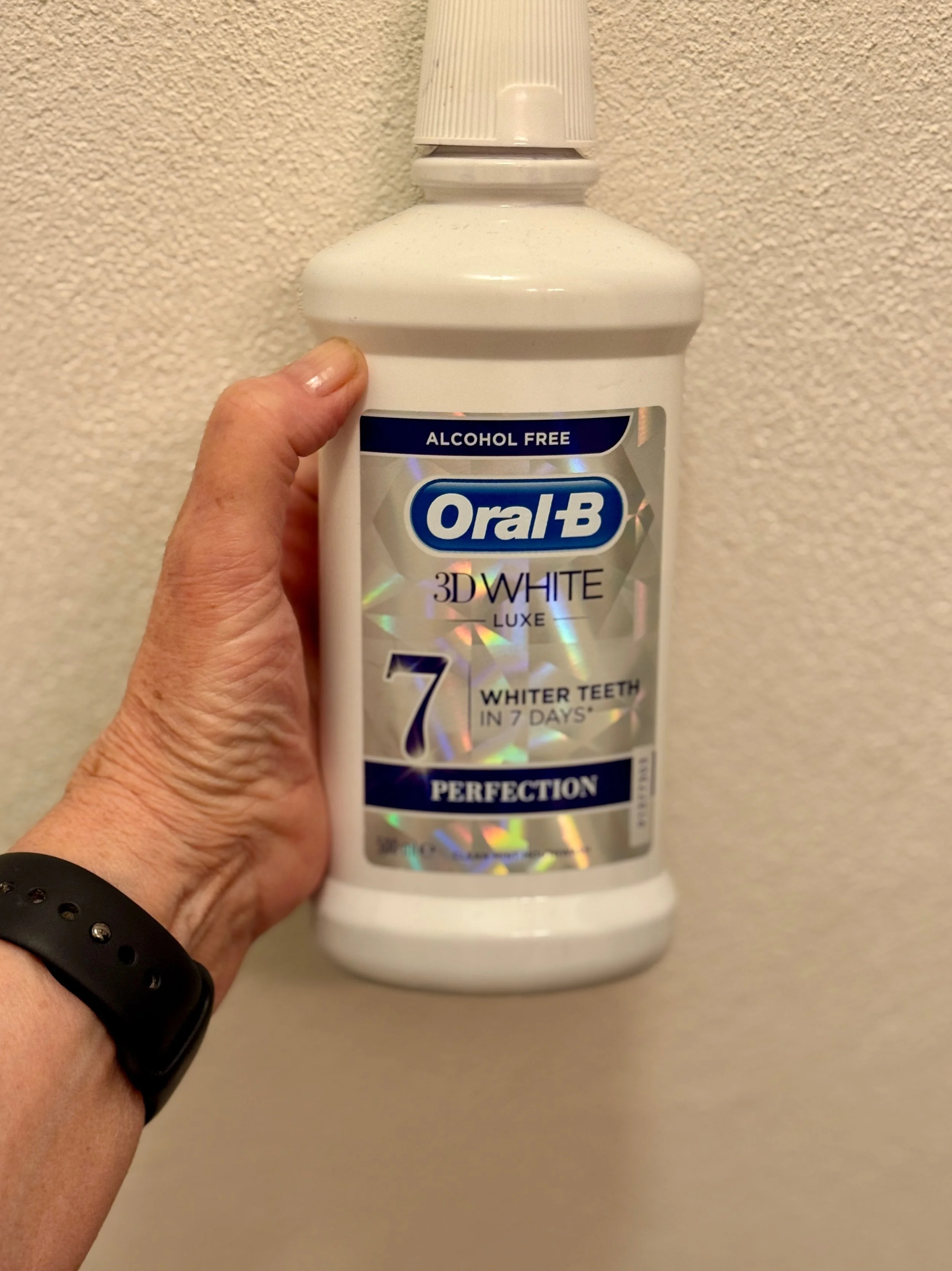 Ved min sidste tandbørstning om aftenen, skyller jeg min mund i Oral-B 3DWhite