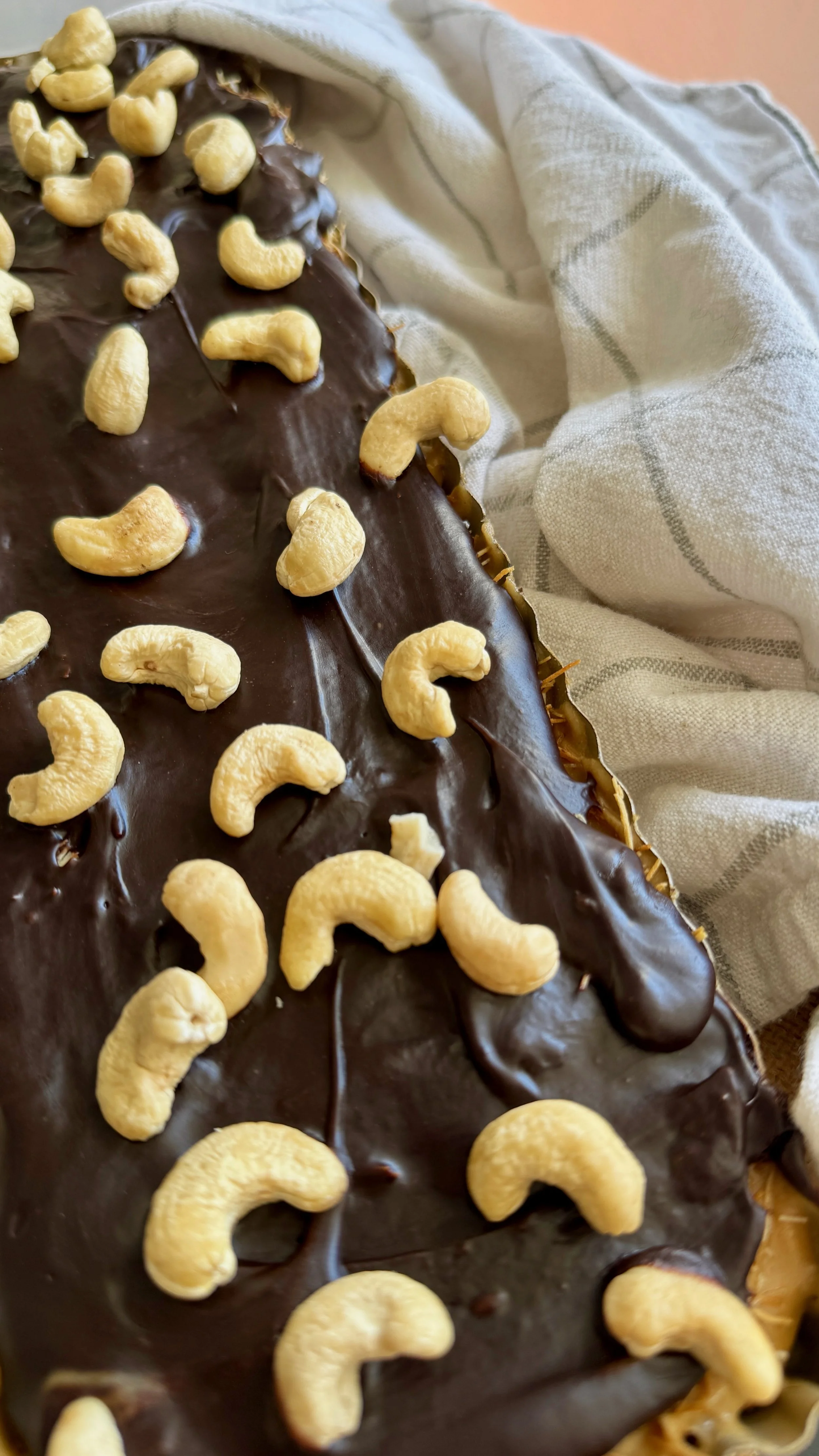 Fordel ganachen oven på karmellen i et jævt lag. Top med en håndfuld cashewnødder. Sæt tærten i køleskabet indtil servering, så den kan nå at sætte sig lidt. Opbevar ligeledes på køl.
